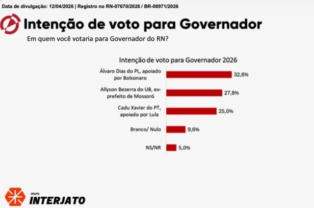 O ex-prefeito de Natal, Álvaro Dias (PL), aparece na liderança da corrida pelo Governo do Rio Grande do Norte, segundo pesquisa do Instituto Affare divulgada nesta segunda-feira (13) pela 94 FM. O pré-candidato soma 32,6% das intenções de voto. Na sequência, surge o prefeito de Mossoró, Allyson Bezerra (União Brasil), com 27,8%, seguido pelo secretário