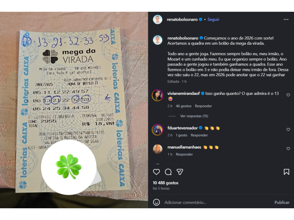 Renato já iniciou a publicação no Instagram afirmando que ganharam: “Começamos o ano de 2026 com sorte! Acertamos a quadra em um bolão da Mega da Virada Todo ano a gente joga. Fazemos sempre bolão eu, meu irmão, o Mozart e um cunhado meu. Eu que organizo sempre o bolão”.