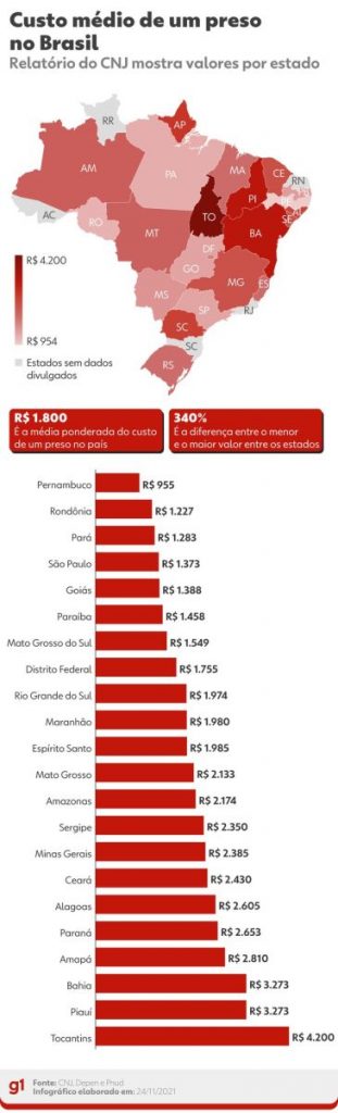 O valor de R$ 1.800 é uma média ponderada levando em conta a população carcerária de todos os estados. Há, no entanto, diferenças gritantes: enquanto em Pernambuco o custo é de R$ 955 por preso por mês, no Tocantins esse valor chega a R$ 4.200. Veja a tabela abaixo: