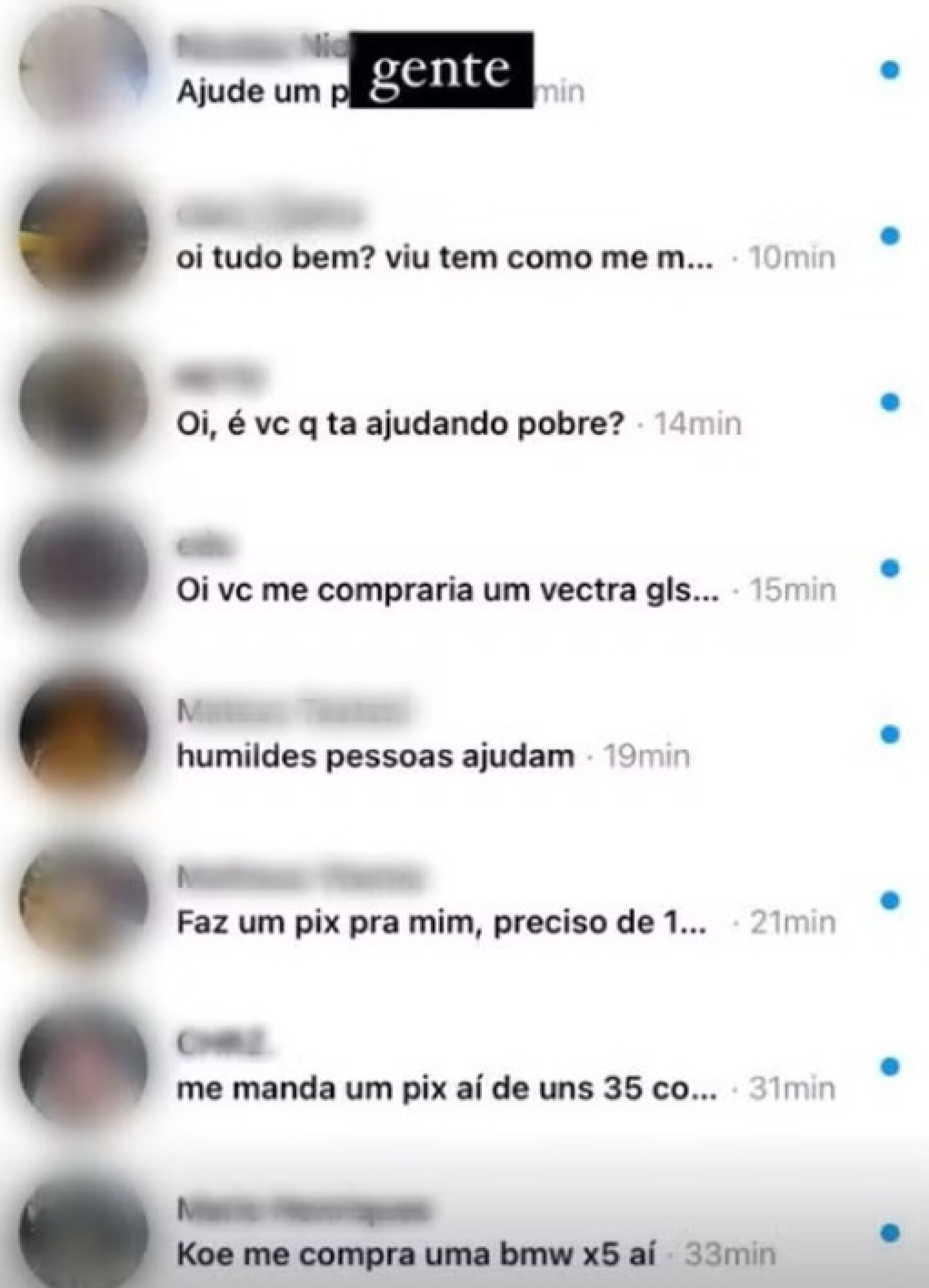 Ela recebeu pedidos de transferências via PIX para cobrir dívidas e até para pagar mensalidades de faculdade. Uma pessoa chegou a enviar uma lista de desejos para que Voi comprasse, e outra pediu ajuda financeira porque sua mãe havia sido vítima de um golpe.