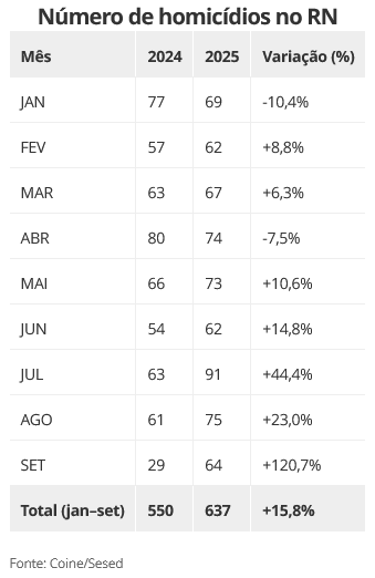 Entre janeiro e setembro de 2025, o estado teve crescimento de 15,8% nos homicídios. Foram 637 mortes violentas neste ano, contra 550 no mesmo período de 2024 — um aumento de 87 vítimas.