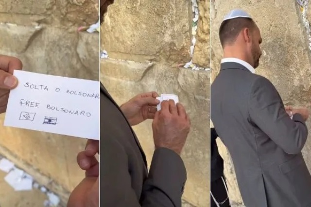 Eduardo filmou o momento em que deposita o papel entre as pedras do muro. No bilhete, escreveu a frase “Solte o Bolsonaro”, em português e em inglês.