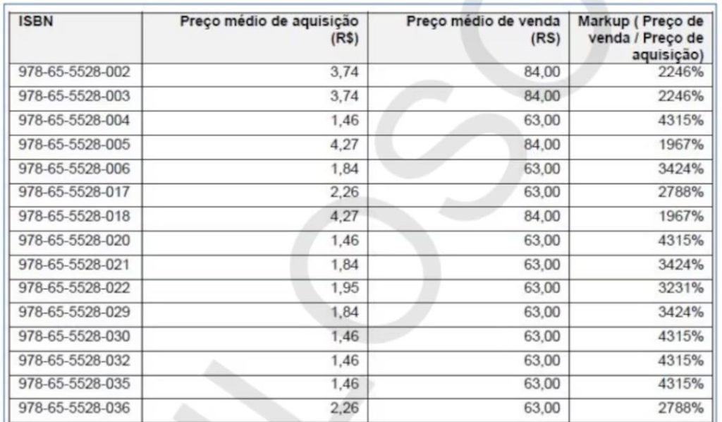 Os investigadores encontraram um padrão nos contratos: a empresa comprou livros por R$ 1 a R$ 5 e revendeu para as prefeituras por até R$ 80 cada.