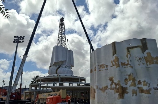 Responsável pela confecção da imagem, o artista pernambucano Ranilson Viana Barbosa explicou que a montagem exige um processo técnico cuidadoso, principalmente por questões de segurança e alinhamento das peças. Segundo ele, parte do corpo da imagem já foi erguida. “Até agora foi montada parte do corpo da imagem. Esse é um processo bem delicado de alinhamento das peças porque a gente evita trabalhar na parte de cima, visto que, por questão de segurança, é melhor trabalhar na parte de baixo”, afirmou.