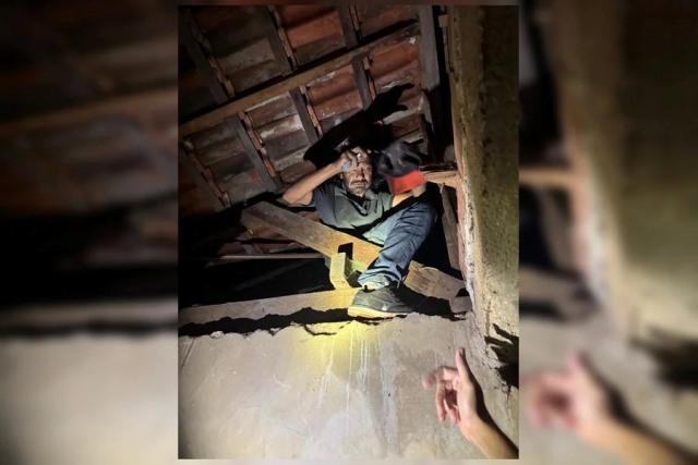 A equipe policial localizou o procurado nas proximidades da casa de sua mãe, ocasião em que ele tentou fugir, entrando na casa e subindo no forro da residência.