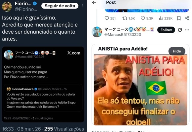 De acordo com o relato incluído no boletim, a mensagem considerada ameaçadora foi publicada em resposta a uma postagem do perfil @FiorinoCarioca, que mencionava conteúdos supostamente extraídos de celulares ligados a investigações envolvendo o banqueiro Daniel Vorcaro e fazia referência ao atentado contra Jair Bolsonaro.