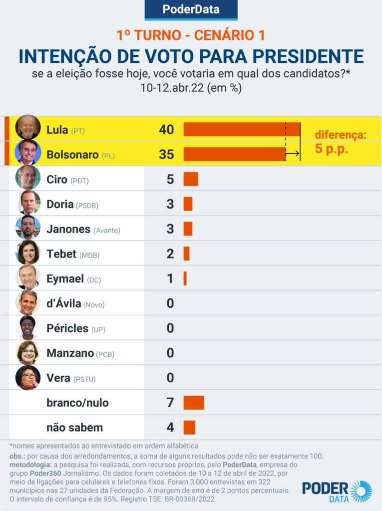 Pesquisa PoderData realizada de 10 a 12 de abril de 2022 mostra que o ex-presidente Luiz Inácio Lula da Silva (PT) tem 40% das intenções de voto para as eleições presidenciais de 2022, seguido pelo presidente Jair Bolsonaro (PL), com 35%.