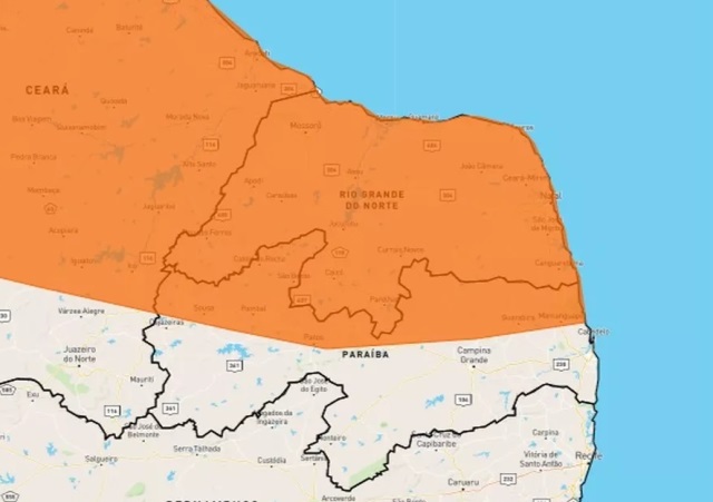 O Inmet também emitiu um alerta de ventos costeiros para 29 cidades do RN. O grau de severidade é de perigo potencial, sendo um alerta amarelo. Veja cidades: