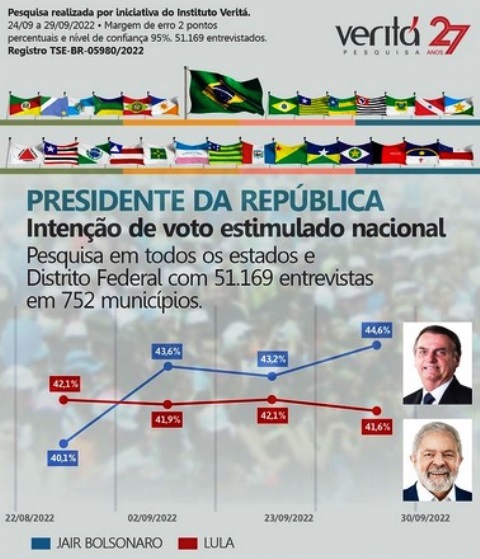 Bolsonaro cresce e atinge 44,6% da intenção contra 41,6% de Lula que recuou na quarta rodada de pesquisa para Presidente da República do Instituto Veritá, divulgada nas primeiras horas deste sábado, 1 de outubro, onde mostra, véspera do primeiro turno das eleições 2022.