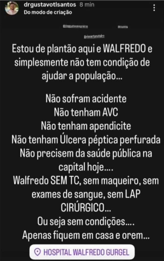 “Não sofram acidente, não tenham AVC, não tenham apendicite, não tenham úlcera péptica perfurada, não precisem da saúde pública na capital hoje”, desabafou o médico. Ele reforçou que, diante da situação crítica, o Walfredo Gurgel “simplesmente não tem condição de ajudar a população” e fez um alerta duro: “Apenas fiquem em casa e orem”.