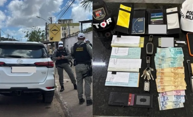 Durante a revista no interior do veículo, os militares encontraram cheques que somavam cerca de R$ 2 milhões, além de cinco cartões de crédito em nome de terceiros, uma nota promissória no valor de R$ 250 mil e mais de R$ 2 mil em espécie.