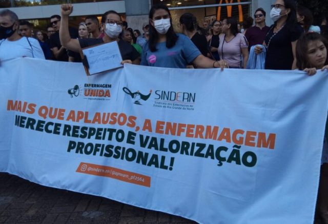Profissionais de enfermagem fazem protesto na tarde desta sexta-feira 9, em frente ao Shopping Mydway Mall. A mobilização é organizada pelo Sindicato dos Enfermeiros do Estado do Rio Grande do Norte (Sindern), Conselho Regional de Enfermagem do Rio Grande do Norte (Coren-RN) e outras entidades sindicais e se manifestam contra a decisão do ministro Luís Roberto Barroso, que suspendeu, no último domingo 4, a lei que fixou o piso salarial de enfermeiros em R$ 4.750, para os setores público e privado.