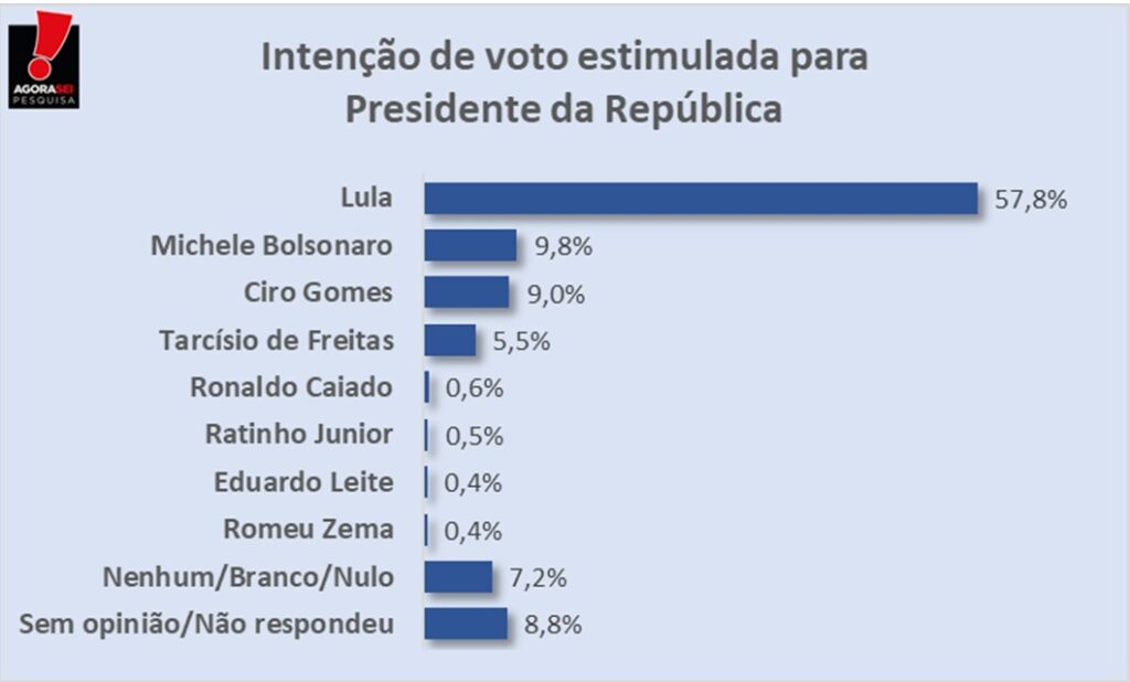 Em segundo lugar aparece a ex-primeira dama Michele Bolsonaro, com 9,8%, empatada tecnicamente com Ciro Gomes (9,0%). Na sequência surgem Tarcísio de Freitas (5,5%), Ronaldo Caiado (0,6%), Ratinho Junior (0,5%), Eduardo Leite (0,4%) e Romeu Zema (0,4%).
