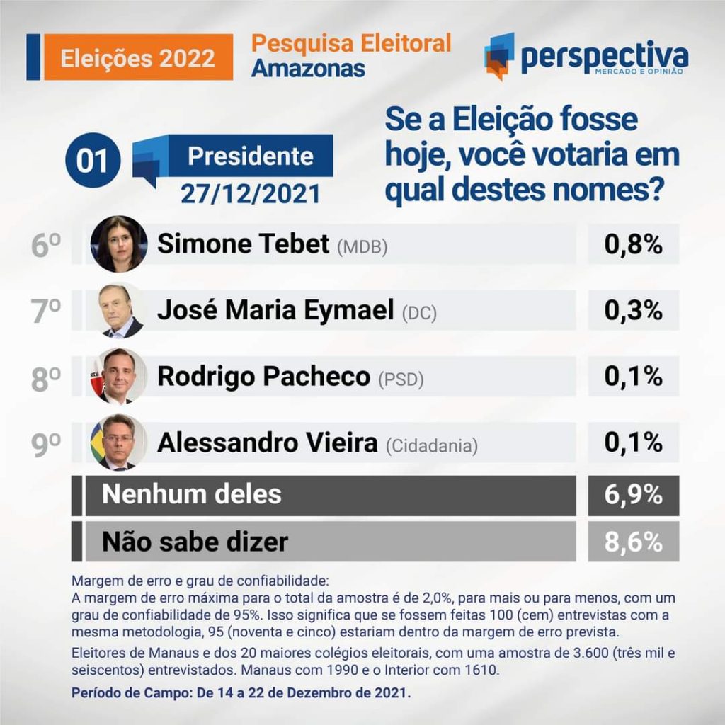 Considerando a margem de erro de dois pontos percentuais, a última pesquisa eleitoral de 2021 realizada pela Perspectiva Mercado e Opinião no Amazonas, aponta empate técnico entre Bolsonaro e Lula.