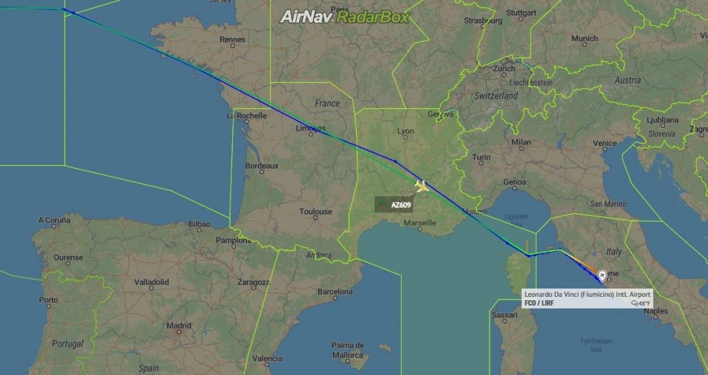 Dados da plataforma de monitoramento AirNav RadarBox mostram que o voo da ITA entrou na região sob o controle de Marselha (FIR – Flight Information Region) às 3h25 (UTC).