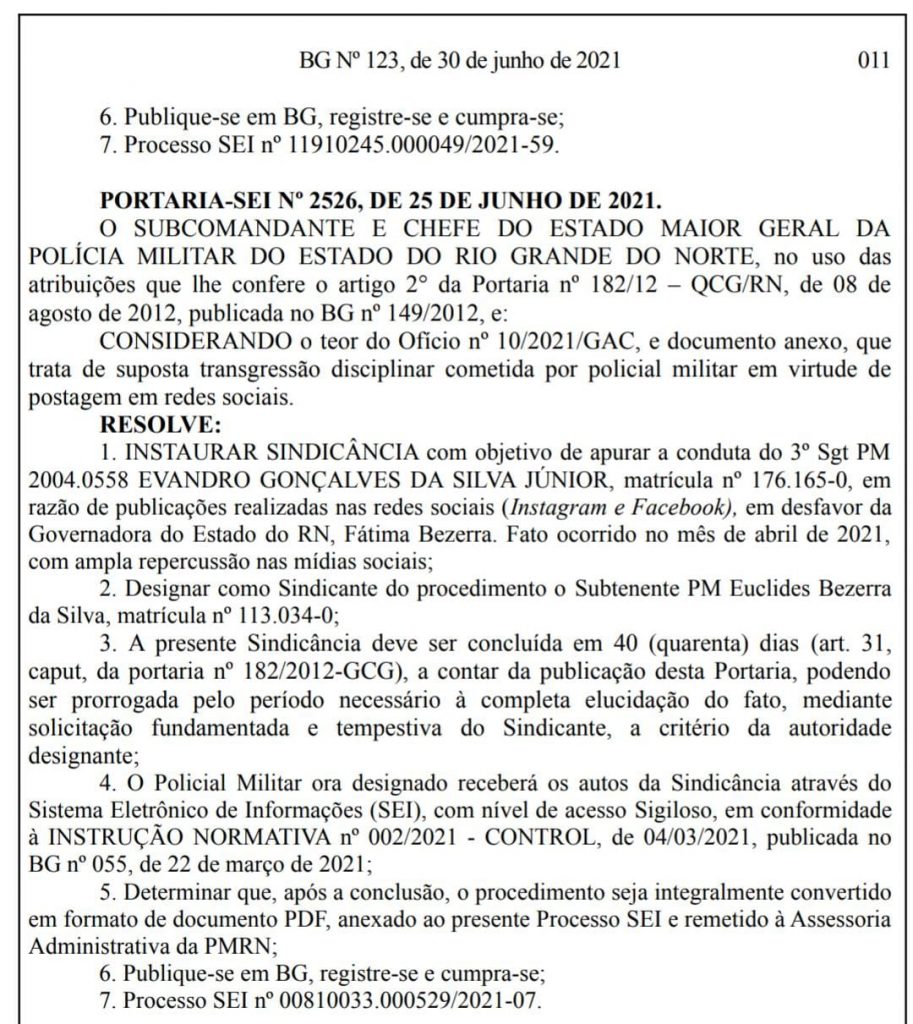 O motivo são publicações feitas em redes sociais “em desfavor” da governadora do estado Fátima Bezerra, diz portaria publicada no Boletim Geral nº 123, desta quarta-feira (30).