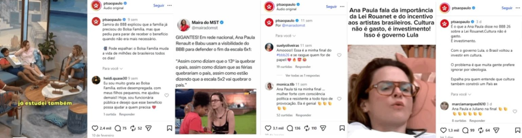 Desde o início da atual edição do reality, o diretório paulista do partido já publicou ao menos 10 conteúdos utilizando falas da participante em diferentes contextos políticos e sociais. Em uma das postagens, feita em 10 de fevereiro, o PT compartilhou um vídeo de Ana Paula comentando sobre o Bolsa Família e escreveu: “Pode espalhar: o Bolsa Família muda a vida de milhões de brasileiros todos os dias!”.