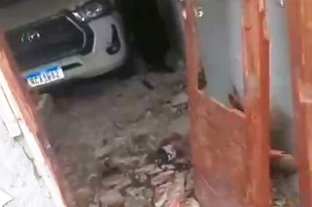Na residência é possível ver as marcas dos tiros de dentro e de fora. Havia também uma caminhonete na garagem.